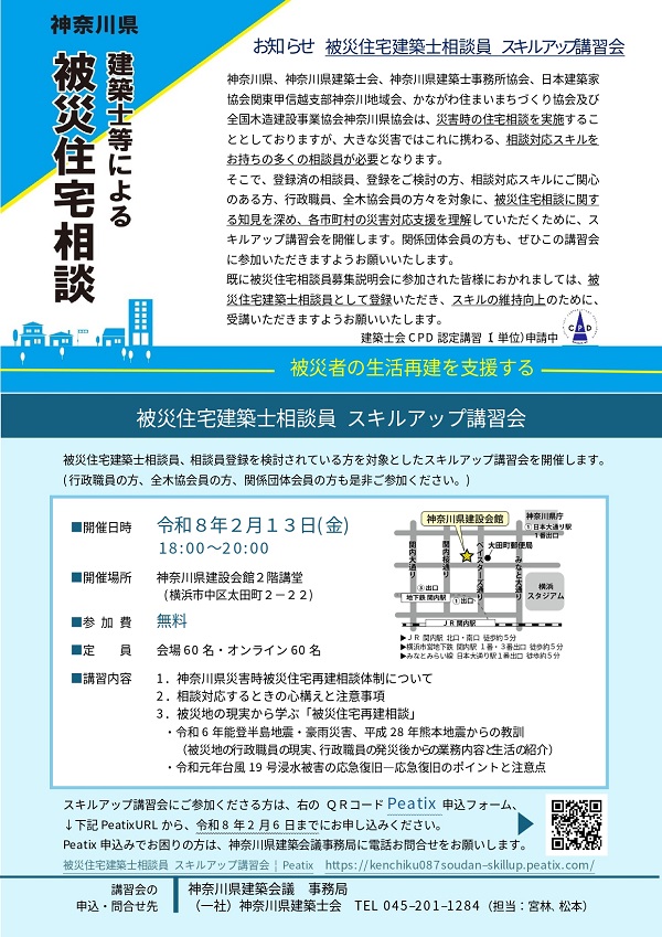 神奈川県建築士会、神奈川県建築士事務所協会、日本建築家協会関東甲信越支部神奈川地域会で組織された神奈川県建築会議が、被災住宅建築士相談員・相談員登録を検討している建築士や、関心のある行政職員、全国木造建設事業協会神奈川県協会会員、関係団体会員等を対象にしたスキルアップ講習会を開催します。被災住宅建築士相談員は、建築関係5団体が県との協定に基づき大規模災害発生時の被災者支援を実施するため、相談体制の整備を進めています。講習会は参加費無料。開催概要は、次の通りです。